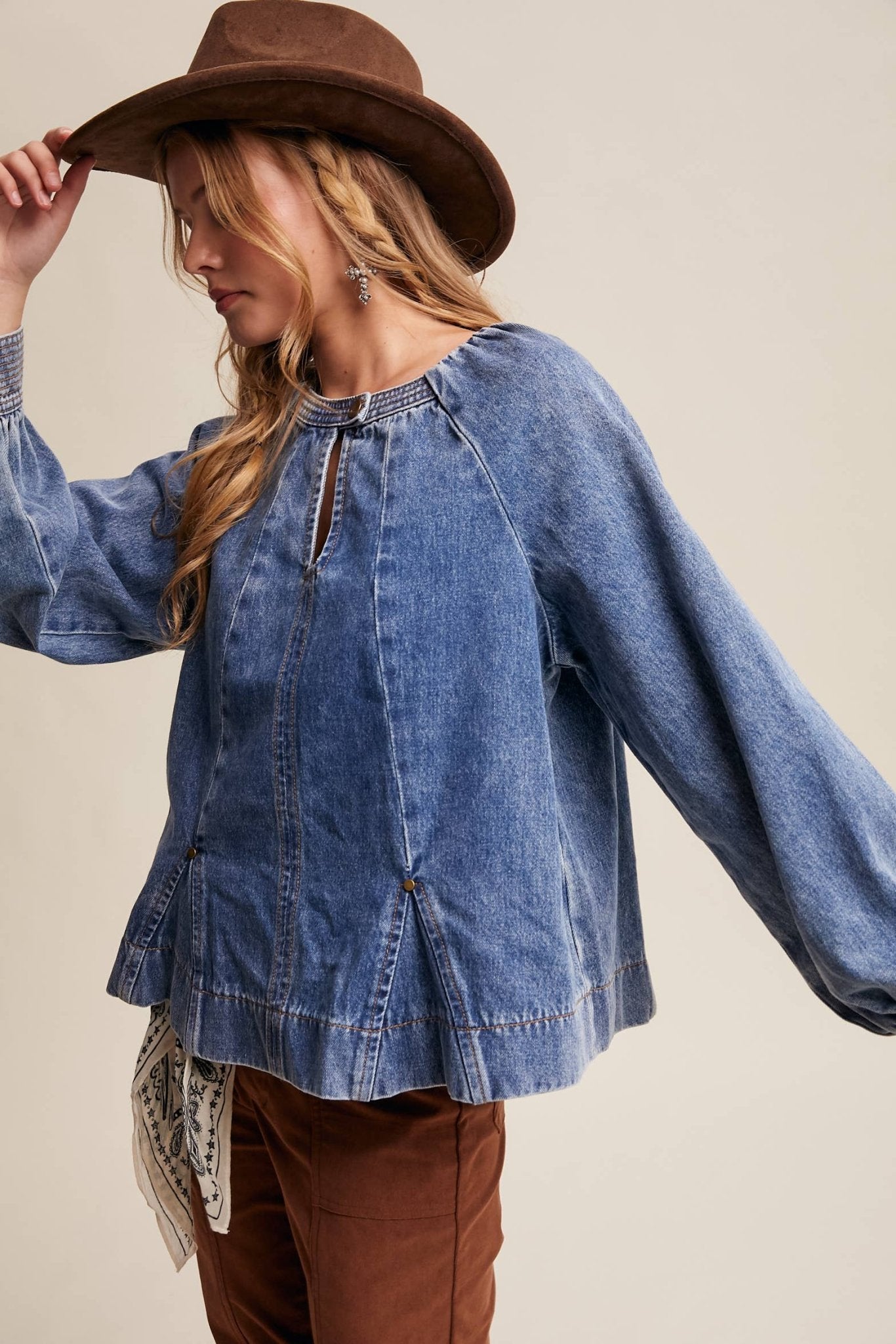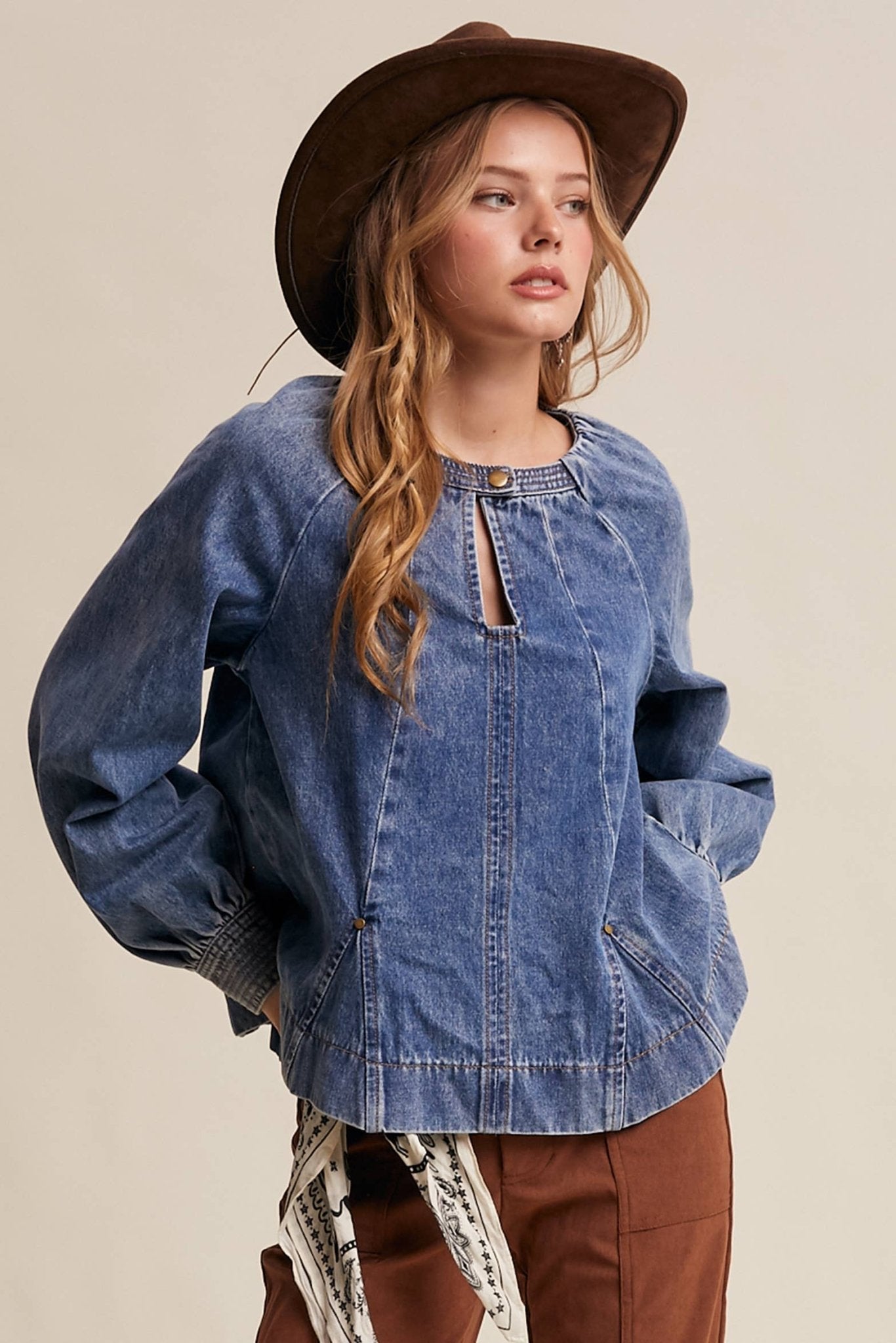 Western Denim Keyhole Blouse