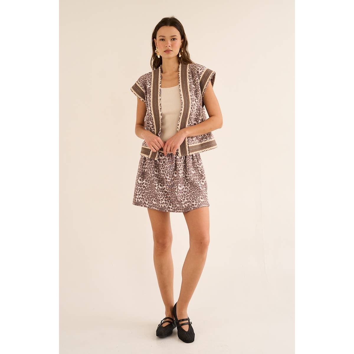 Let your wild side out with our leopard knit skirt. Made from durable yet movable soft fabric, express your fierce fashion in comfort. The pretty, solid brown and cream lined waistband detail adds a touch of delicacy perfect for a casual day or dressed up for a fun night out. Pair it with our M2320 cami tank and M2432 matching top for an eye catching, one of a kind look.