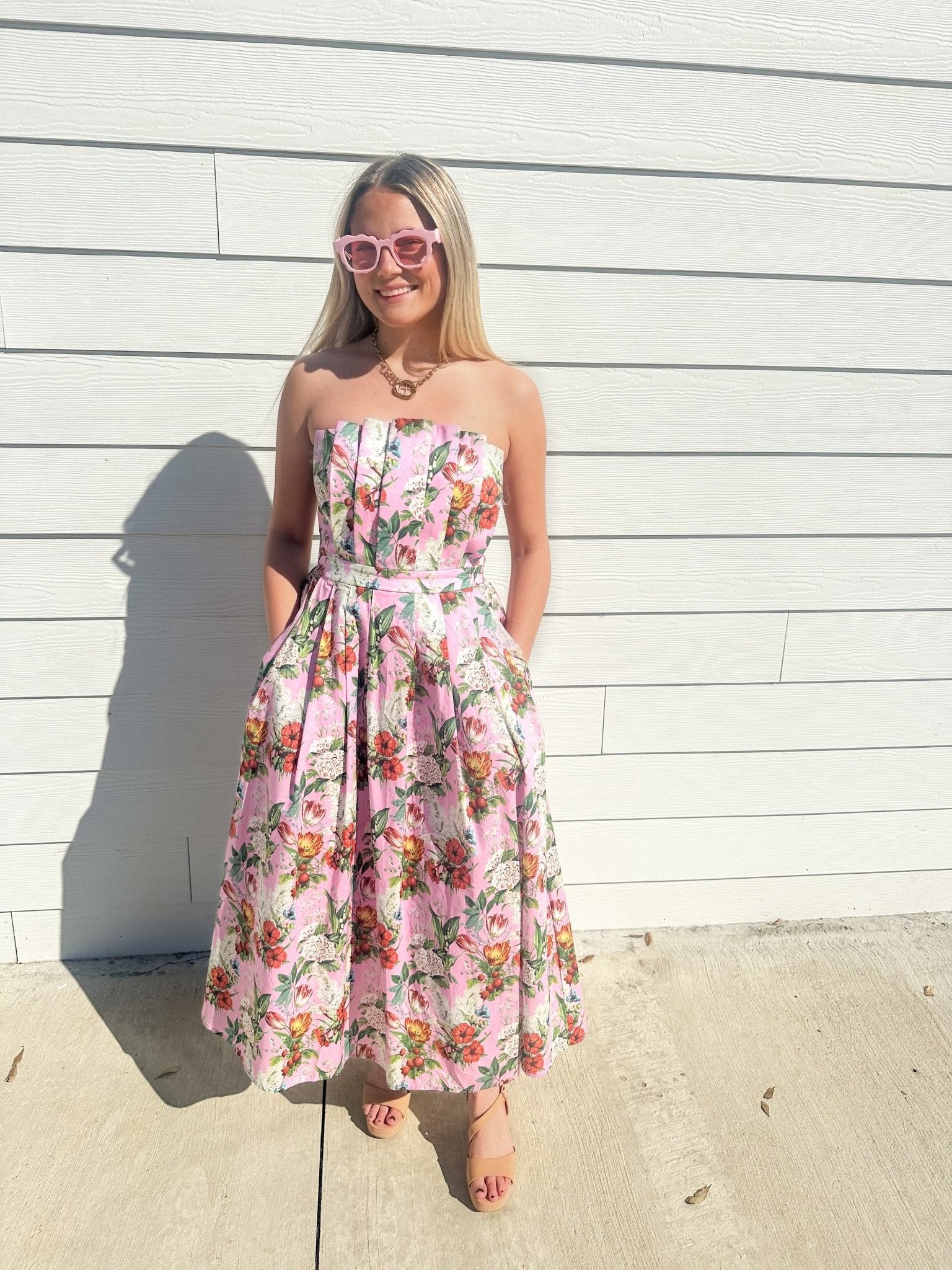 Floral Pleated Strapless Midi Dress