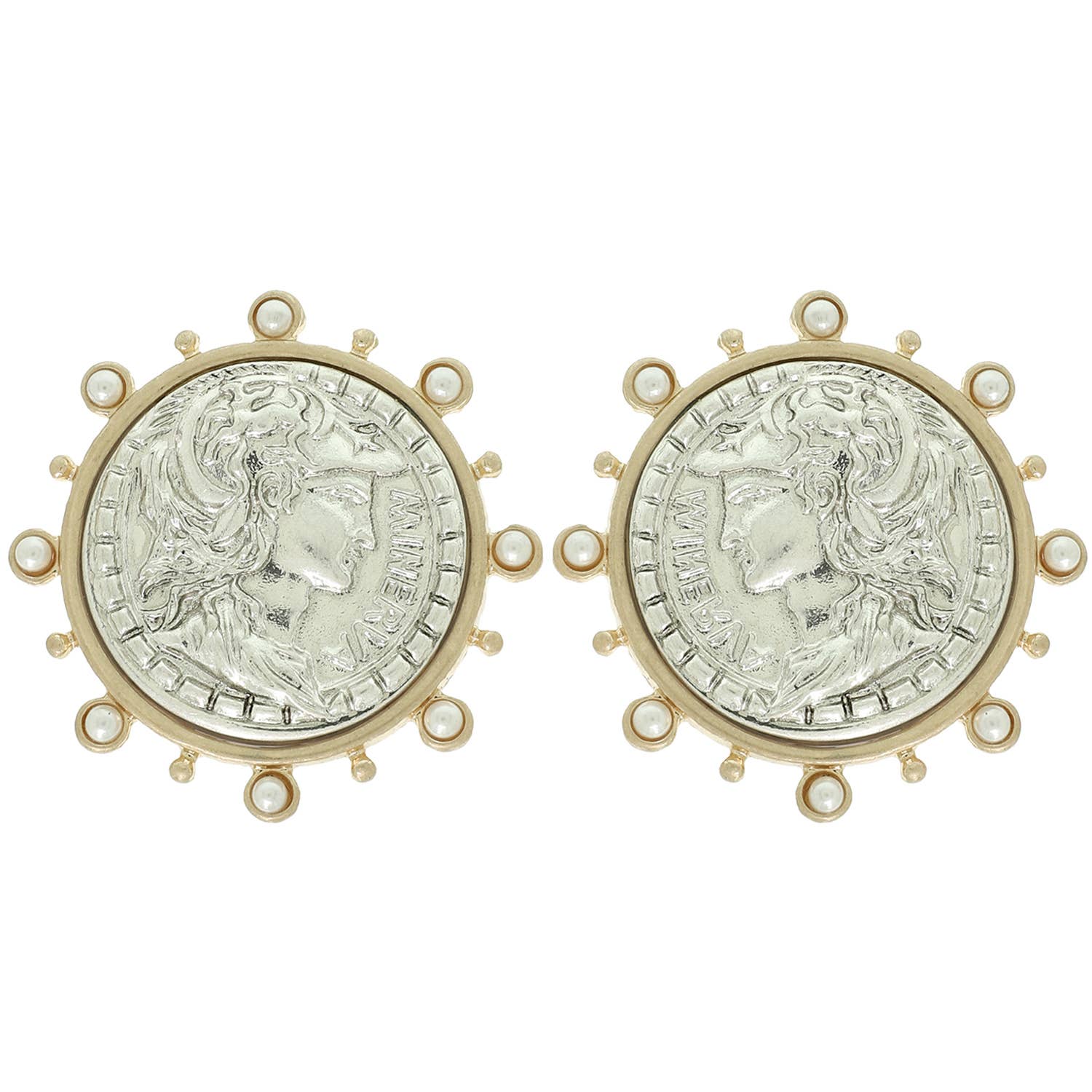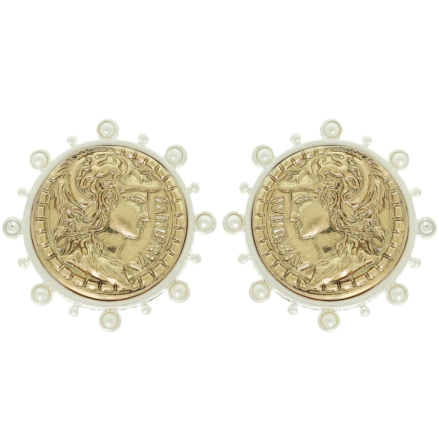 Introducing the Minerva Roman Imperial Coin Earrings - a stunning tribute to ancient history. These earrings feature genuine Roman coins, adding a unique touch to any outfit. Made from high-quality materials, each pair is a one-of-a-kind piece. Elevate your style and show off your love for history with these earrings. HEIGHT: 1.4" WIDTH: 1.4