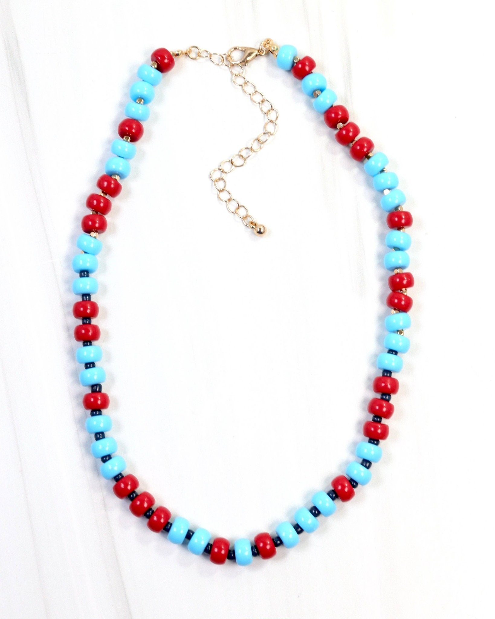 Elevate your game day look with the Ellison Stone Necklace in red and powder blue. This stylish piece shines on its own or layered with other necklaces, making it a versatile accessory to showcase your team spirit with flair. Perfect for adding a fashionable touch to any outfit while celebrating your favorite colors.