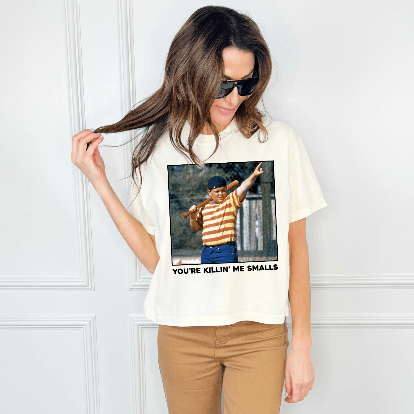 Channel your inner sporty spirit with this stylish crop tee. With the bold and playful "You're Killing Me Smalls" phrase, this tee is perfect for any casual day out. Made with comfortable and durable fabric, it's sure to become your new go-to shirt.