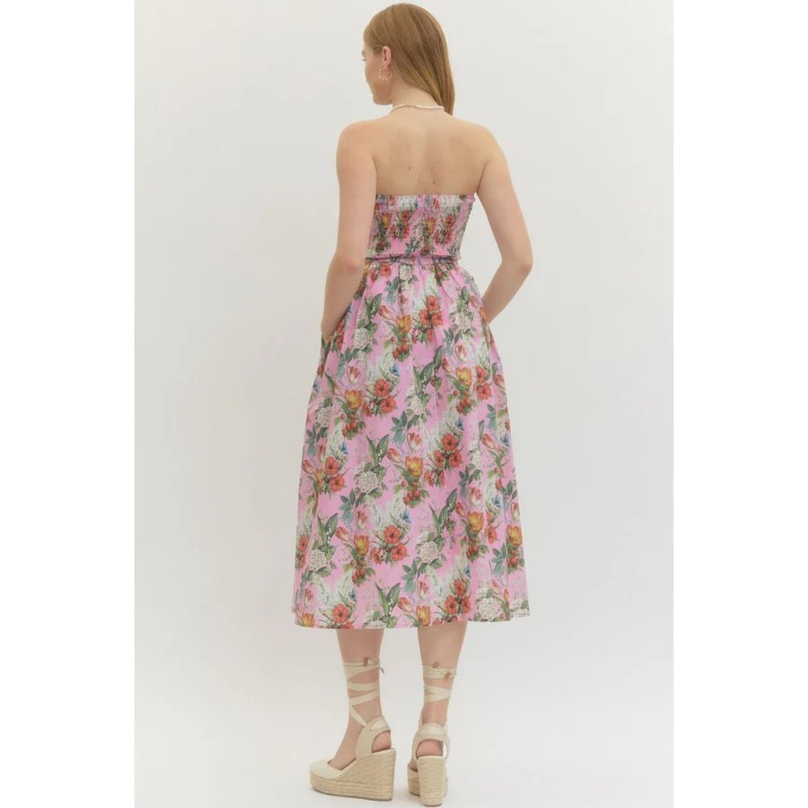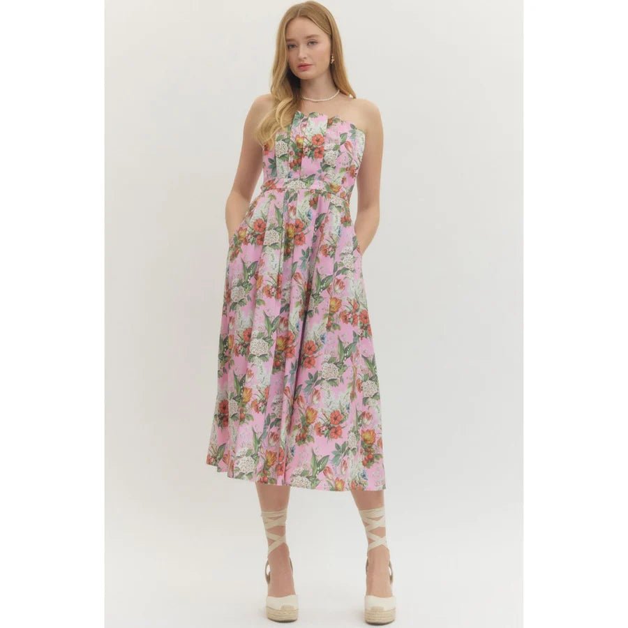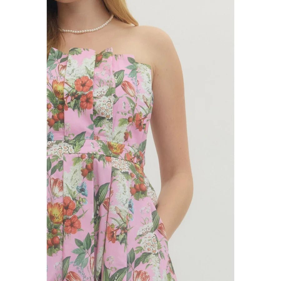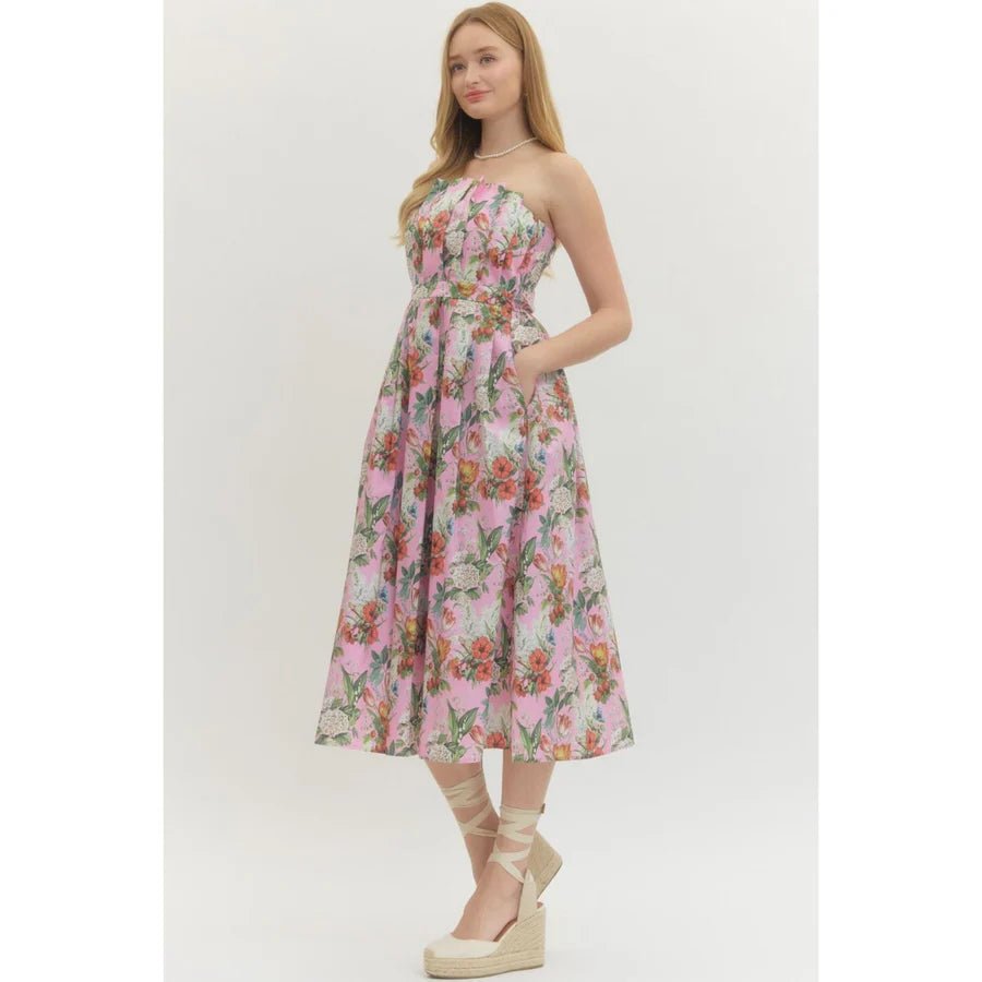 Floral Pleated Strapless Midi Dress
