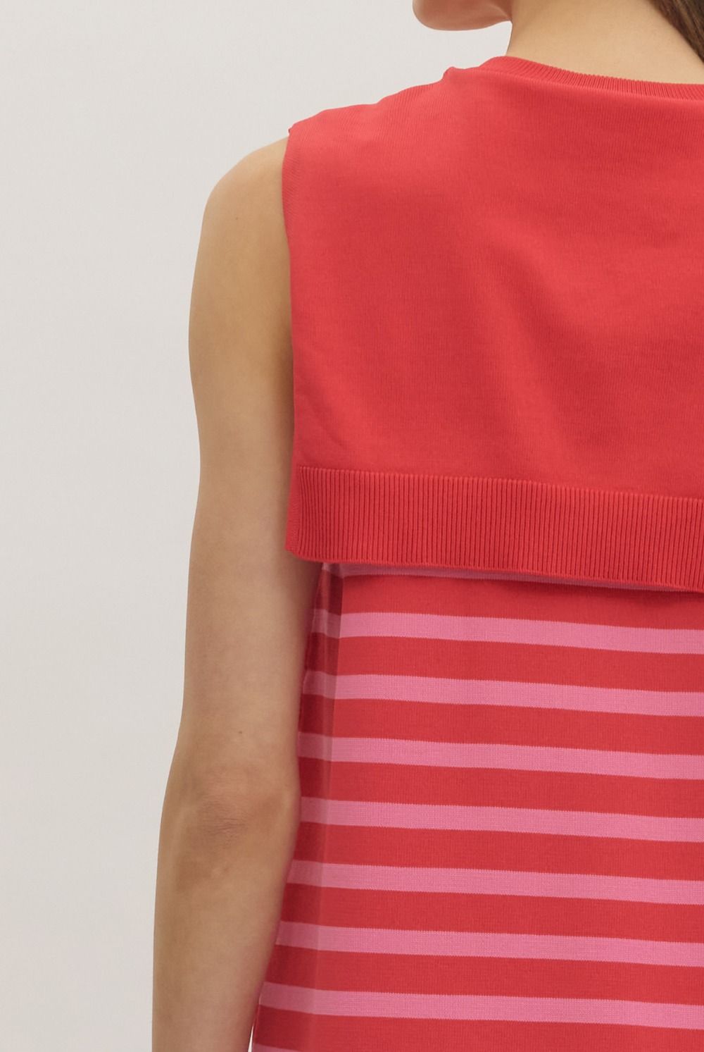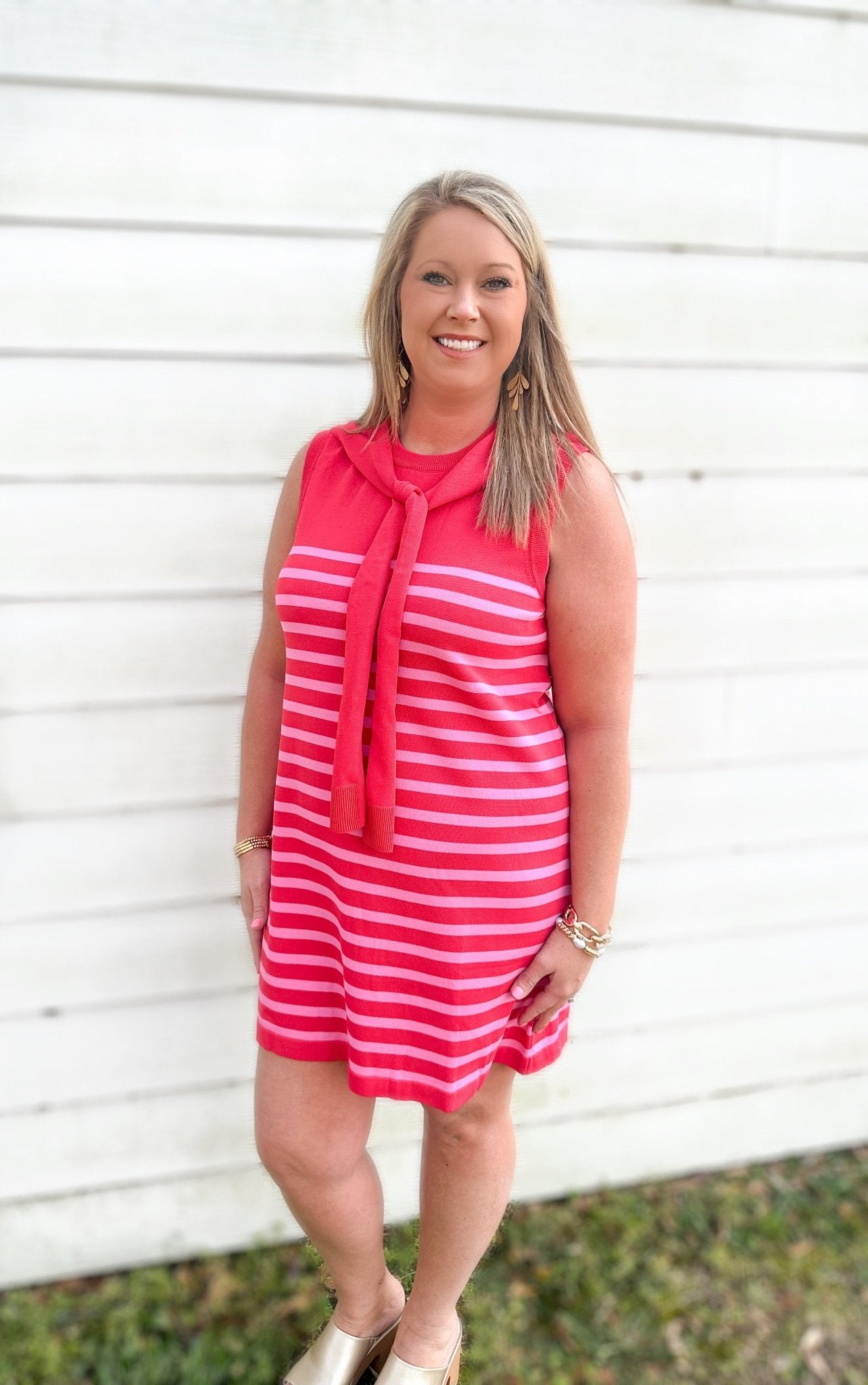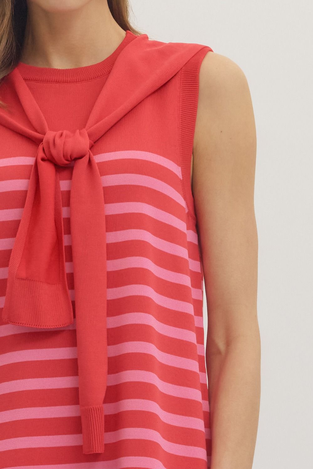 Striped sleeveless mini dress featuring knit scarf tie detail at neckline. Unlined. Knit. Non-sheer. Lightweight.