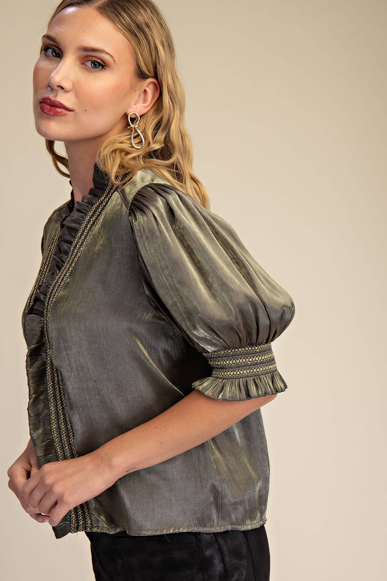 Olive Ruffle V-Neck Smocked Puff Sleeve Blouse