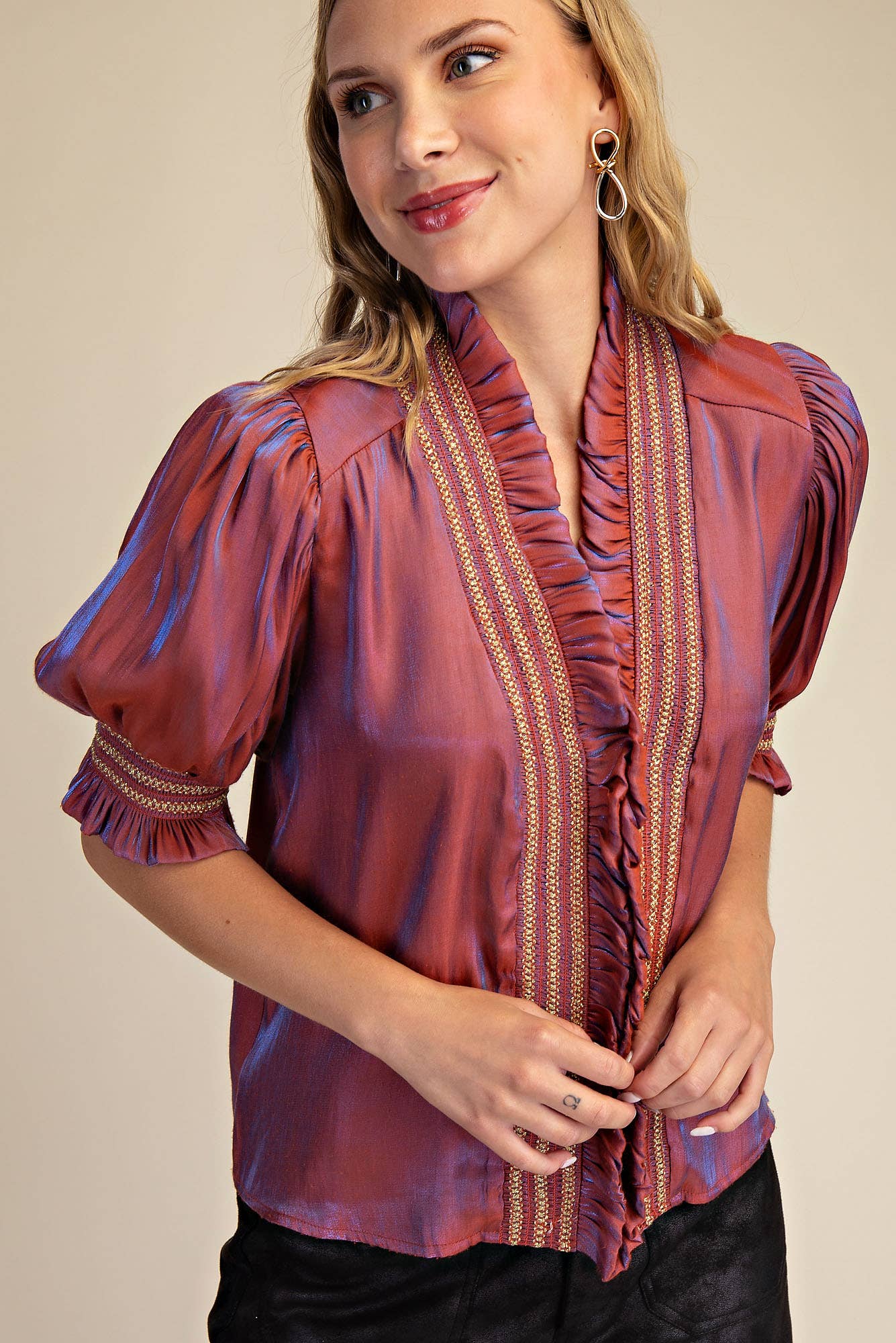 Rust Ruffle V-Neck Smocked Puff Sleeve Blouse