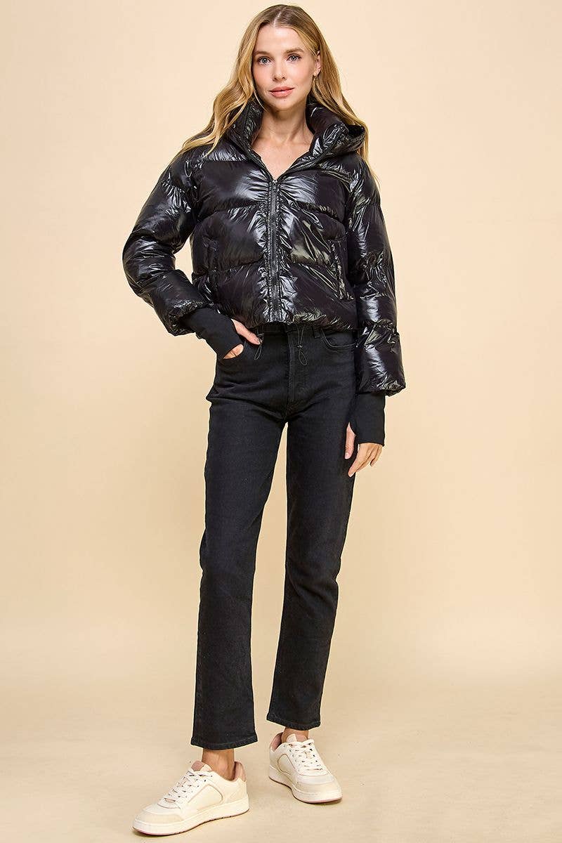 Black Thumb Hole Opening Hooded Puffer Jacket