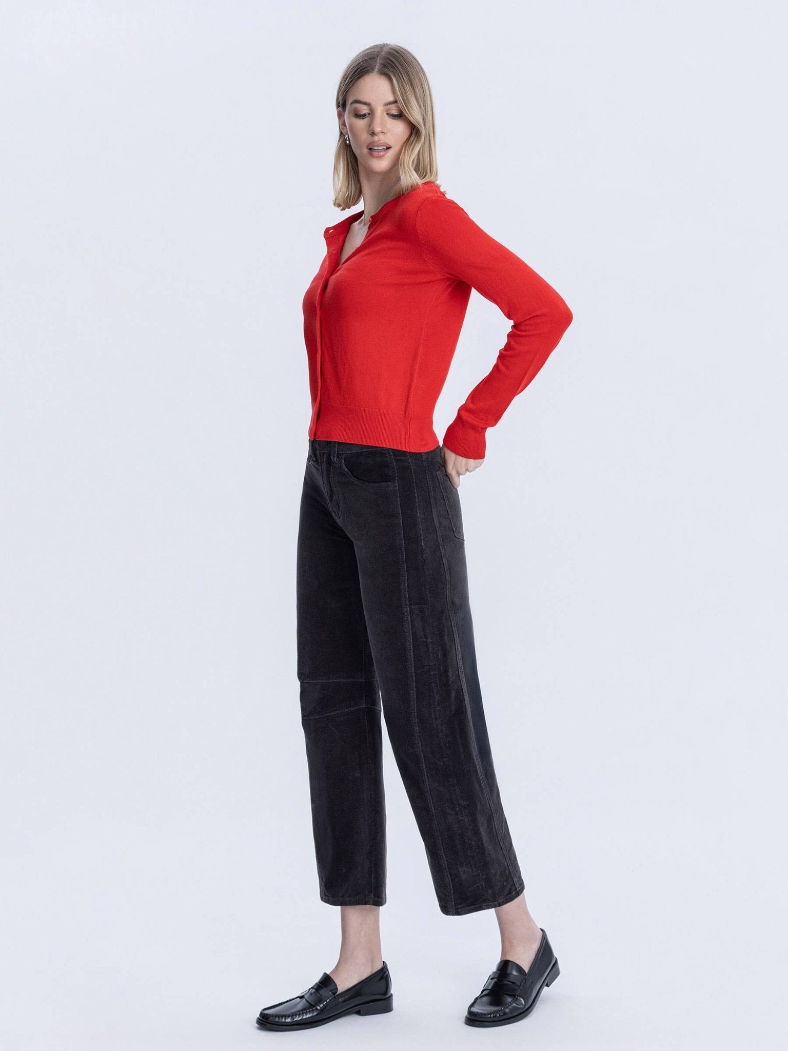 HIGH RISE DARK GRAY CORDUROY BARREL JEANS COMFORT STRETCH DENIM, HIGH RISE WAIST, SEAM DETAIL, FINISHED HEM, CROPPED LENGTH, DARK GRAY, CORDUROY BARREL JEANS F. RISE: 10" / INSEAM: 27" / LEG OPENING: 16 1/2" MODEL IS 5'10" WEARING A SIZE 26