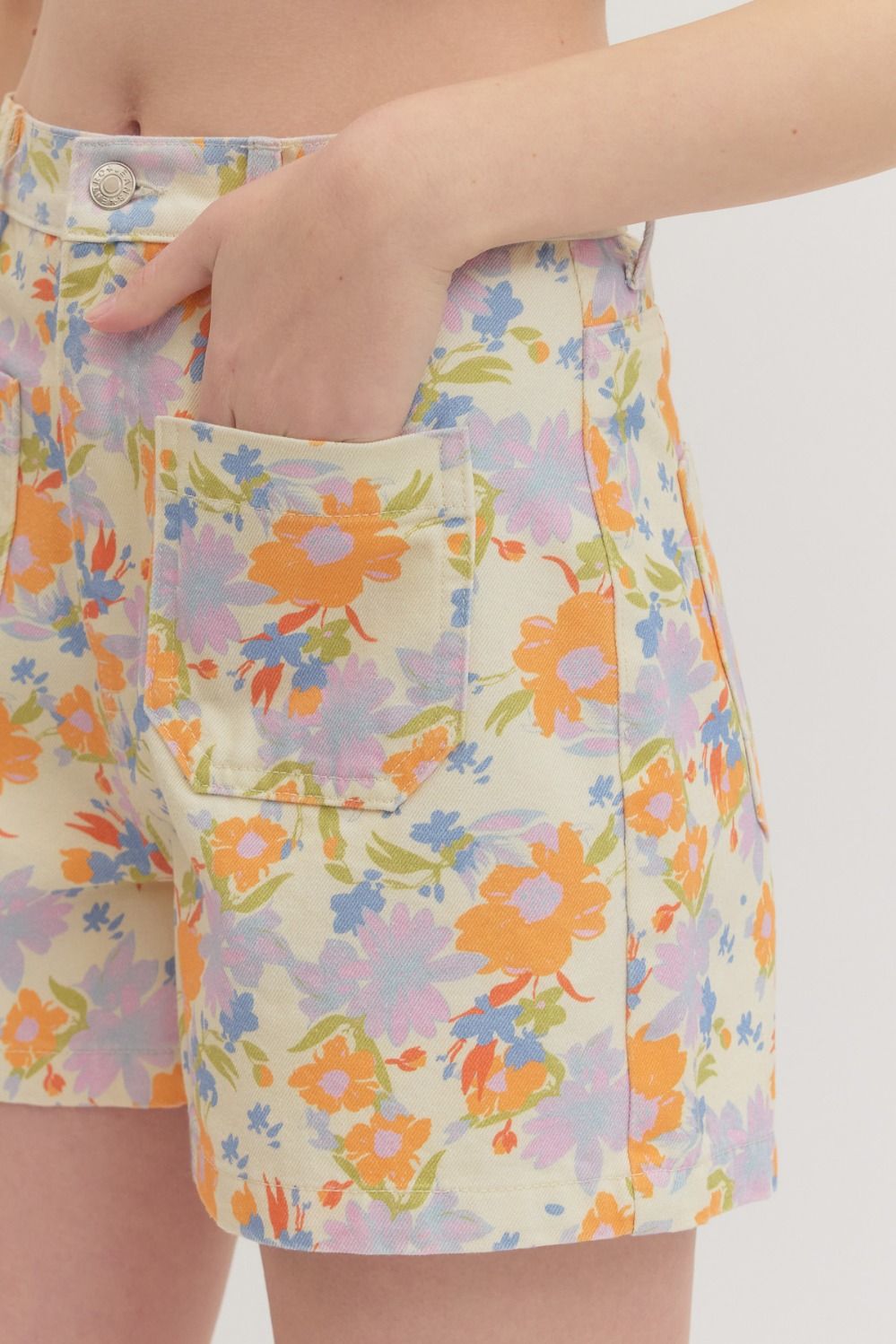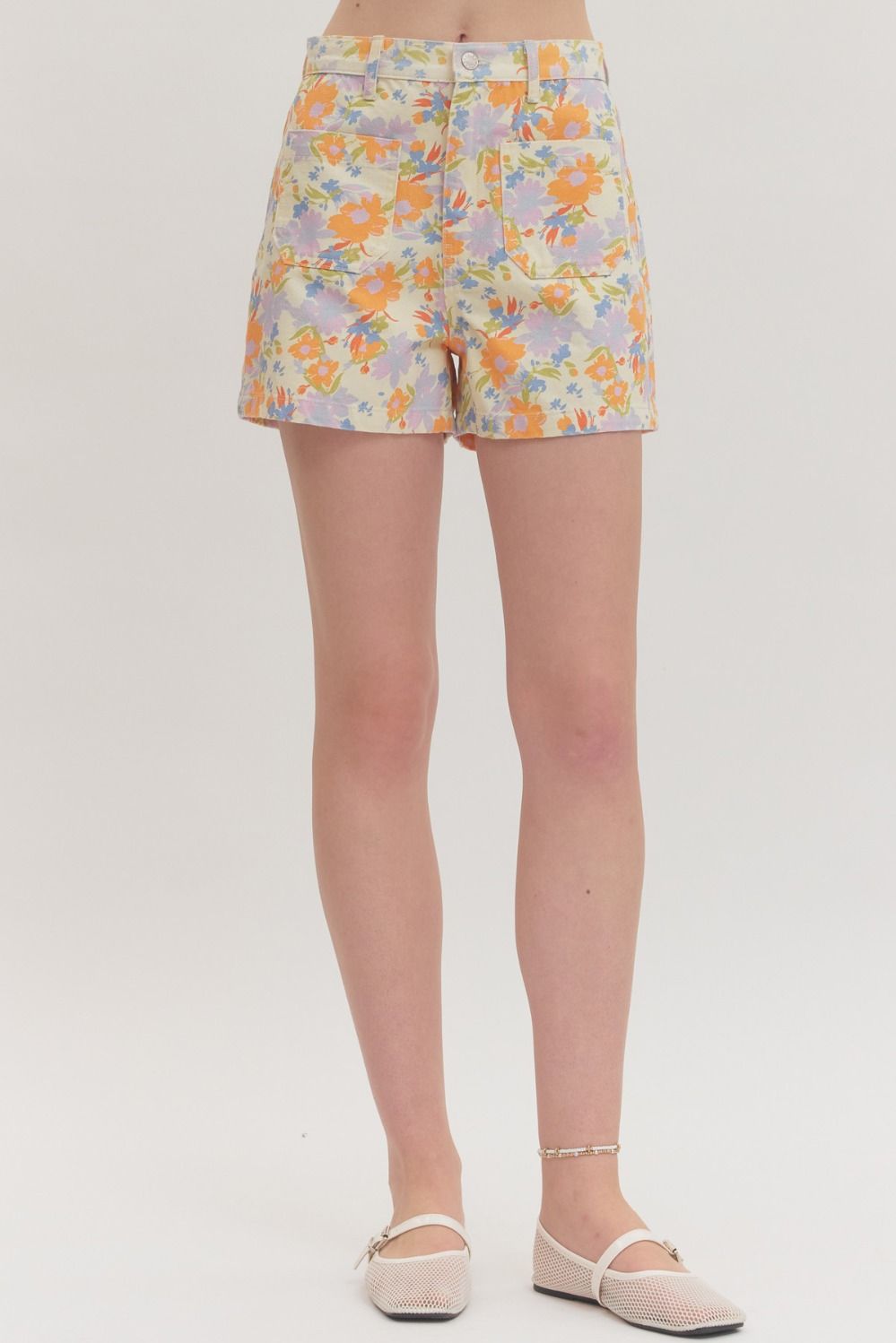 Botanical print high-rise shorts featuring patch pockets at front. Zip-fly button front closure. Patch pockets at back. Unlined. Woven. Non-sheer. Lightweight