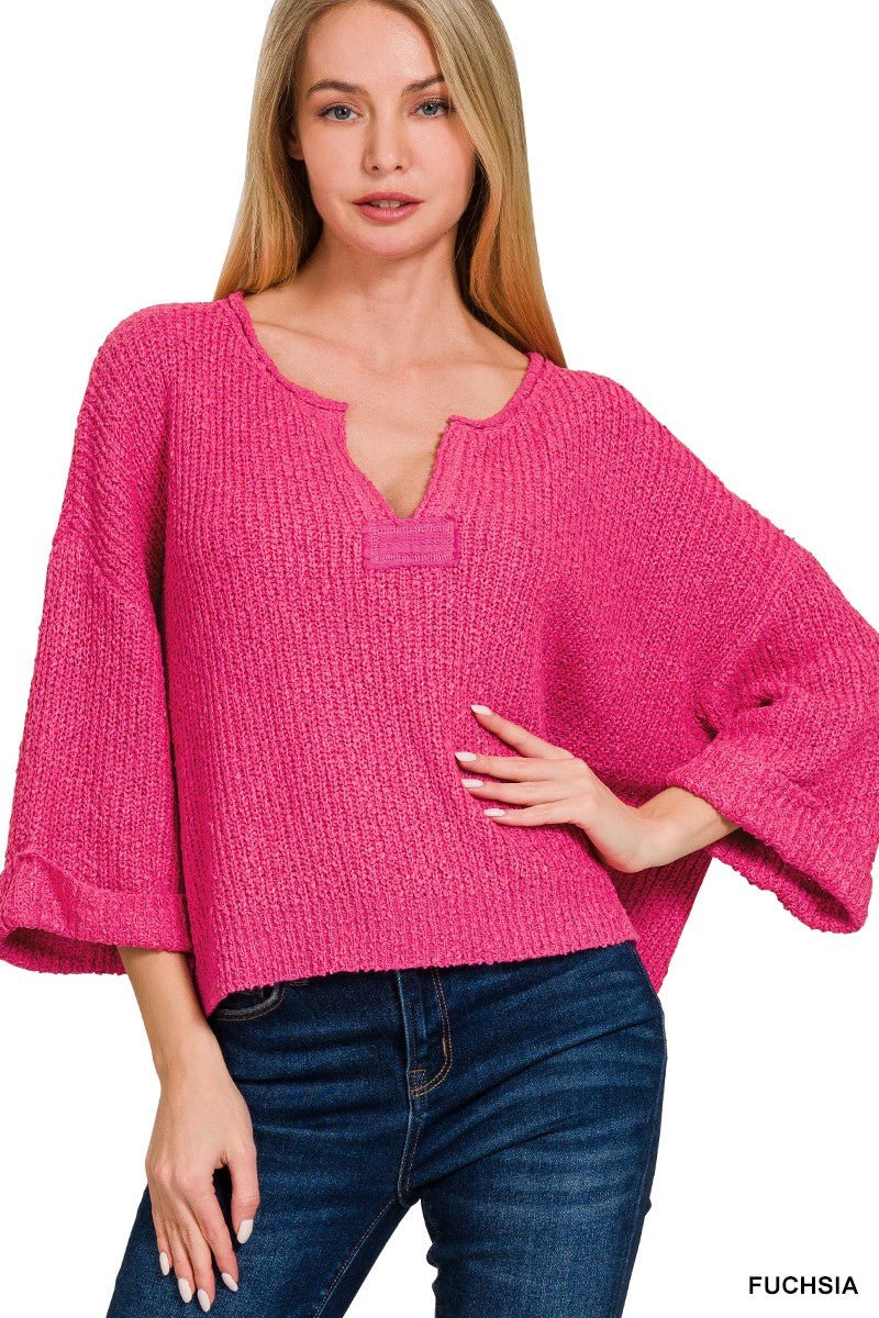 FRONT SLIT PATCH FOLDED SLEEVE PULLOVER - SIDE SLIT - LOOSE FIT TOTAL BODY LENGTH: 19", CHEST: 53" approx. - MEASURED FROM S/M ** COLOR MAY VARY SLIGHTLY DUE TO MONITOR RESOLUTION