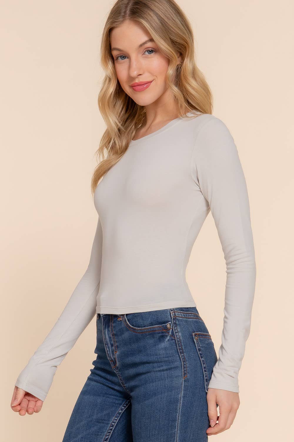 T13740 - Silver Long Sleeve Crew Neck Cotton Crop Top