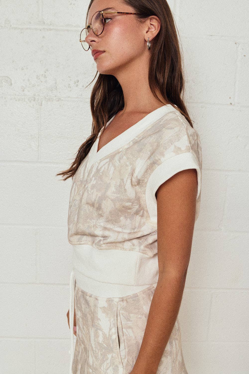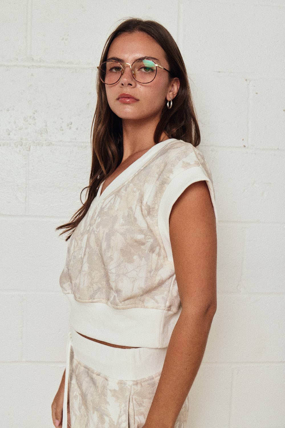 Elevate your casual days with this soft and relaxed lounge set designed for effortless comfort. The sleeveless top features a flattering V neckline and a slightly cropped silhouette for an easy laid back vibe. The matching skirt includes a stretchy waistband with a drawstring detail and a smooth straight fit that keeps the look clean and modern. Lightweight fabric and a subtle tonal pattern make this set perfect for everyday wear travel or weekend lounging