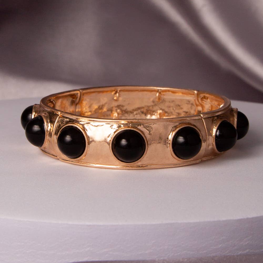 This polished stretch bangle bracelet showcases bezel-set faux cabochons in a sleek gold tone finish, combining everyday elegance with modern simplicity. Its flexible slip-on design ensures a comfortable fit while maintaining a clean, sculpted silhouette that complements both minimal and stacked wristwear styling. Lightweight and versatile, it delivers a refined accent perfect for transitional wear from desk to dinner.