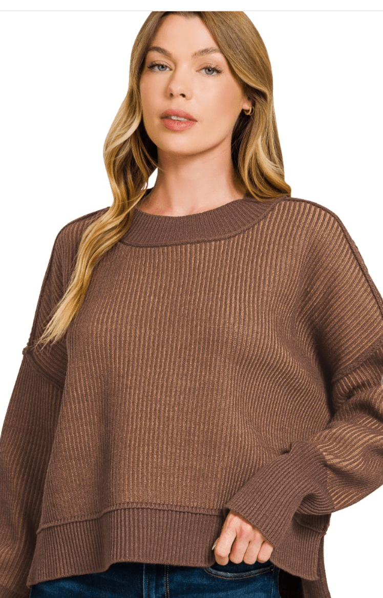 EXPOSED SEAM TWO-TONE SWEATER -HI-LOW, SIDE SLITS TOTAL BODY LENGTH: 20"FRT 21"BACK, CHEST: 52" approx. - MEASURED FROM SMALL