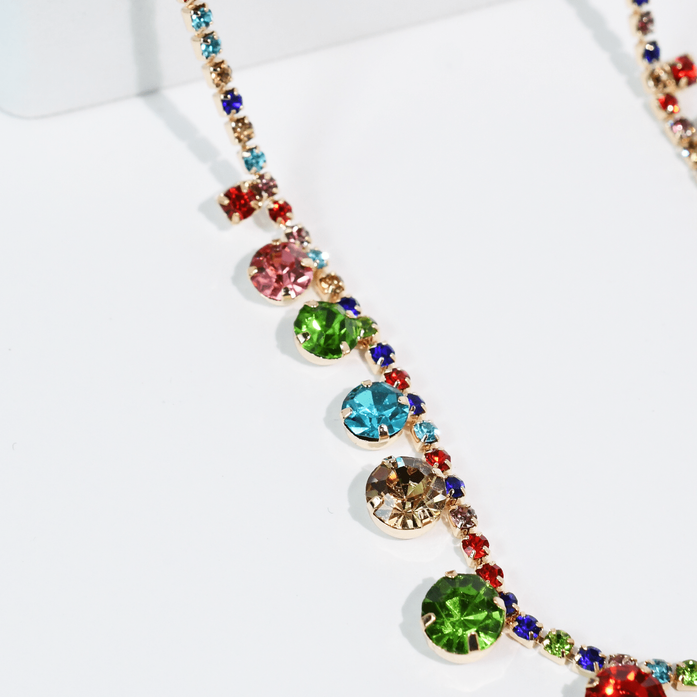 * Bright, playful, and bursting with sparkle! Featuring a delicate crystal lined chain adorned with colorful drop gems. This piece shines with a beautiful mix of vibrant hues that catch the light from every angel.