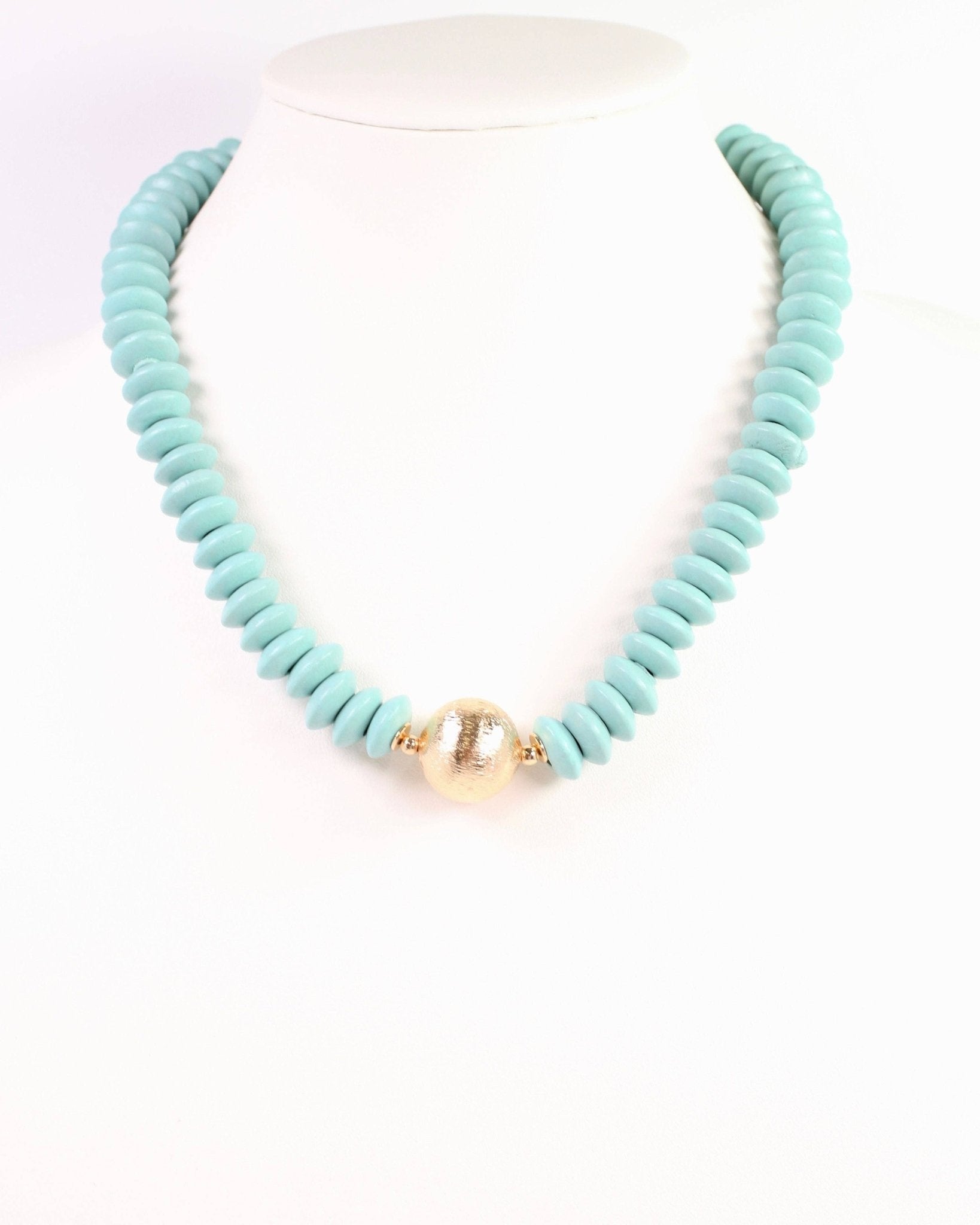 Add a pop of playful charm to any outfit with the Dayle Disc and Ball Necklace inTurquoise. Featuring soft turquoise disc beads paired with a bold, textured gold ball made of brass, this necklace brings a fun mix of earthy tones and shiny accents. Perfect for layering or wearing solo, it’s a delightful way to brighten your look!
