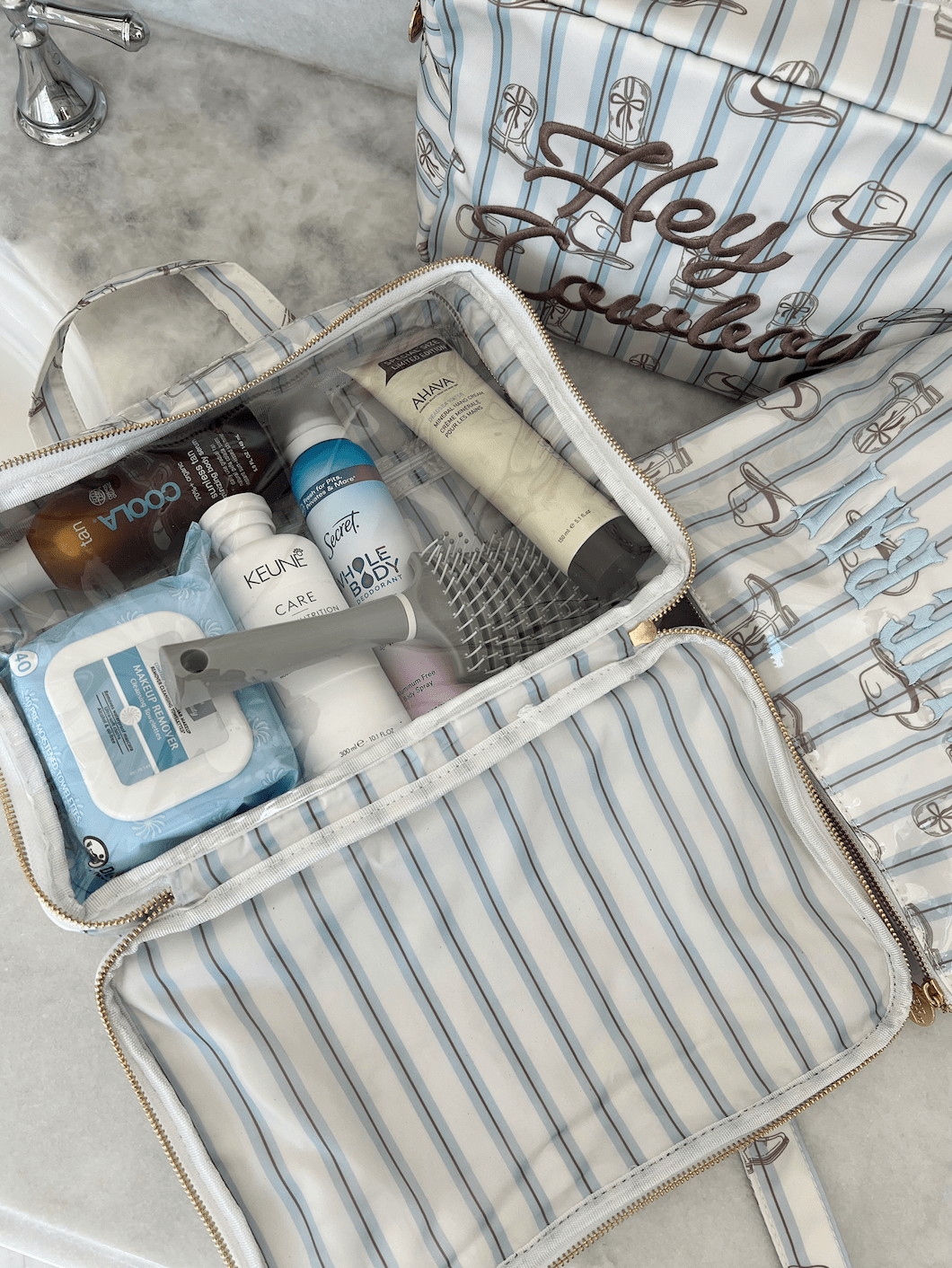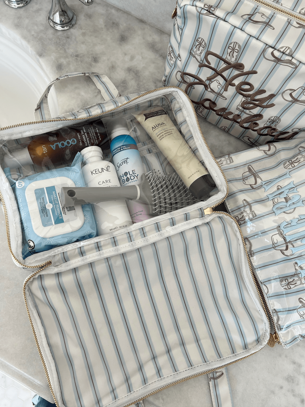 this patterned clear coat toiletry bag is the perfect for traveling on the go!